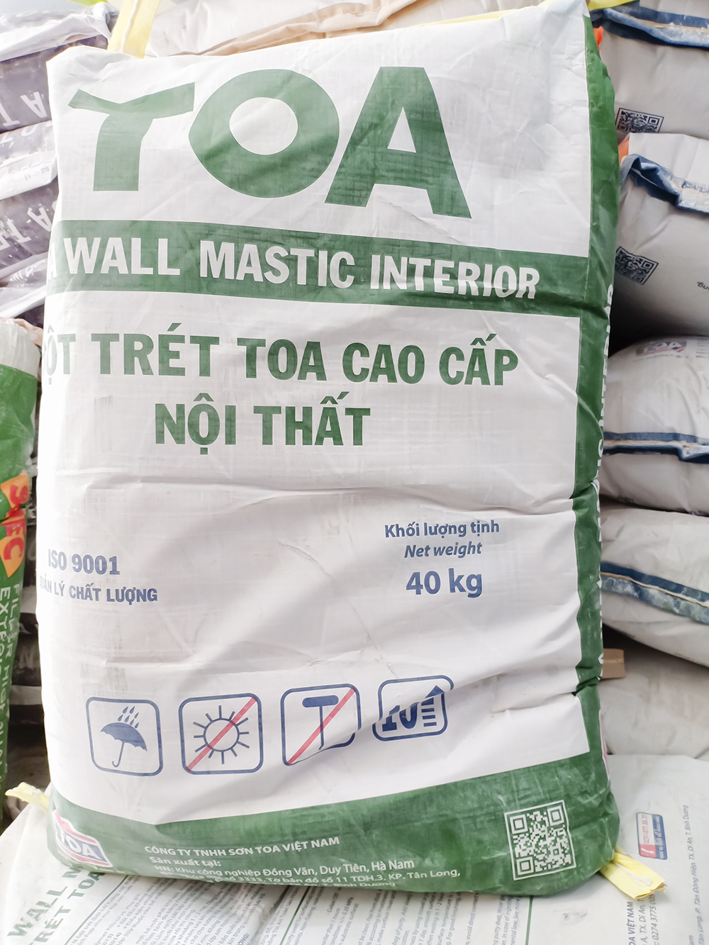 Bột trét TOA Wall Mastic interior là bột trét (bột bả) tường nội thất dùng cho các bề mặt như: tường xi măng, trần nhà, bê tông và các bề mặt cần xử lý trước khi sơn lót hoặc sơn phủ. Thích hợp cho mọi loại sơn nước ngoại thất. Không bong tróc, nứt nẻ. Bền vững với thời gian, chịu đựng mọi thời tiết.